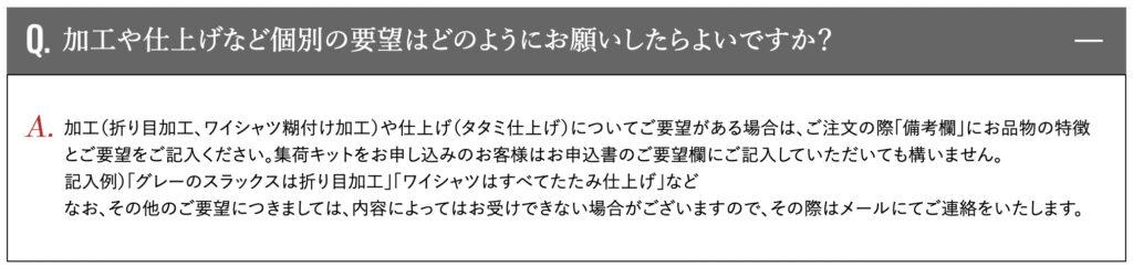 加工(折り目加工、ワイシャツ糊付け加工)や仕上げ(タタミ仕上げ)についてご要望がある場合は、ご注文の際「備考欄」にお品物の特徴とご要望をご記入ください。集荷キットをお申し込みのお客様はお申込書のご要望欄にご記入していただいても構いません。